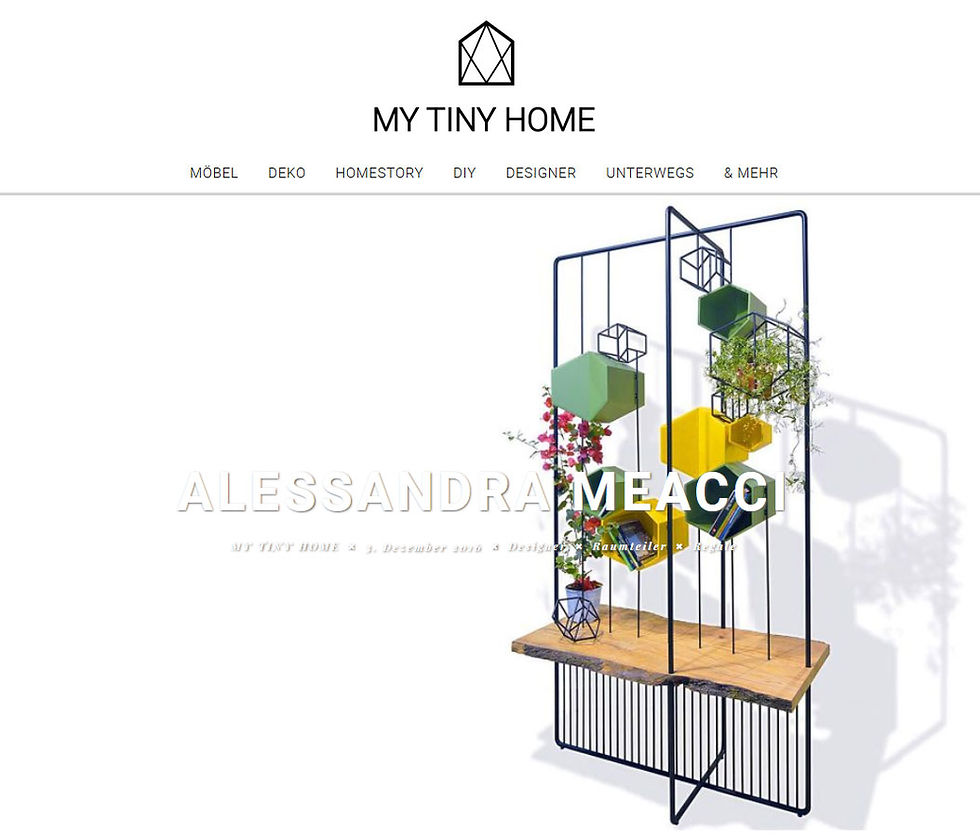 "Product designer, interior designer, architect – Alessandra Meacci is an all-round talent for living design. We met her at the furniture fair in Milan and were especially thrilled by her bookshelf DHARMA, which is also a room divider and a vertical garden at the same time. An ideal piece for small apartments: Thanks to its wireframe structure, it doesn’t take away to much light while creating the feeling of different living areas. This year, it won Alessandra the third place at the international A’Design Award 2016. We say: Congratulations! Alessandra, how did you geht the idea for your bookshelf DHARMA? I was investigating the opportunities of modularity: I used a basic element in different materials, trying to combine the advantages of standardized production to the versatility and customization of the assembly. I chose the hexagonal cell as basic module: I was inspired by the geometry of the hive and, more generally, I was looking for a recurring form in nature. I wanted to give an "organic" feature to the product, because I think that the object of design is something alive in the environment in which it is located, and lives of the changes of the light and the way it interacts with the people using it. What about the plants? DHARMA is a bookshelf with a “green” heart: the essential feature of the product is to give the opportunity to the end user to customize the bookcase by growing climbing plants on its structure, among the wood modules. Dharma is an „living“ object: you can shape it day by day, by choosing the type of plants, how to make them climb the iron rod structure, taking care of them. ––––––––––––––– Alessandra really likes modular forms as well as the integration of living plants into her designs, which you can also see when looking at her plant stands GARDENY. They can be used to grow vertical gardens and green walls, so they are an ideal tool to install greenery on a small balcony or inside, for example as a room divider as well (or of of course in a garden in case you have one). The modules are made of a thin metallic structure so they do look elegant. Each module has three legs, which must be driven in the ground of the garden. On the balcony or inside, you need to stick them into a flower pot on the floor to give them stability. If you install plants in the pot as well as on the GARDENYs, you get a nice vertical garden with different levels. ––––––––––––––– The room divider BOLINA is another fascinating object which due to its size and the round form unfortunately isn’t the first choice for a small apartment. But for people who love plants but don’t have a garden, it is a great idea to create an interior vertical garden. The delicate structure cans also be filled with greenery and plants on your own taste. Alessandra exchanged a lot of the metal rods with textile ropes to give even more lightness to the object – visually as well as practically: As a modular system, the room divider can easily disassembled and transported. You can find more exciting projects on Alessandras website http://www.alemeacci-design.com/ In case you are interested in her products, she’d be happy to get a message from you. Thanks so much, Alessandra, and good luck to you!"