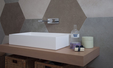 Un bagno in stile nordico , con rivestimenti in tonalità beige e cachemire, un formato esagonale alle pareti per dare un tocco ricercato e l'inserimento di mensoloni in legno con cesti in vimini portatutto.....