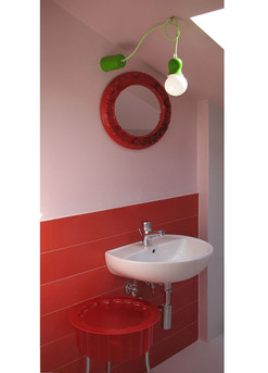 oppure…. uno stile pop con rivestimenti ultracolorati, un dettaglio fluo con la lampada pendente e mobiletto in metacrilato...